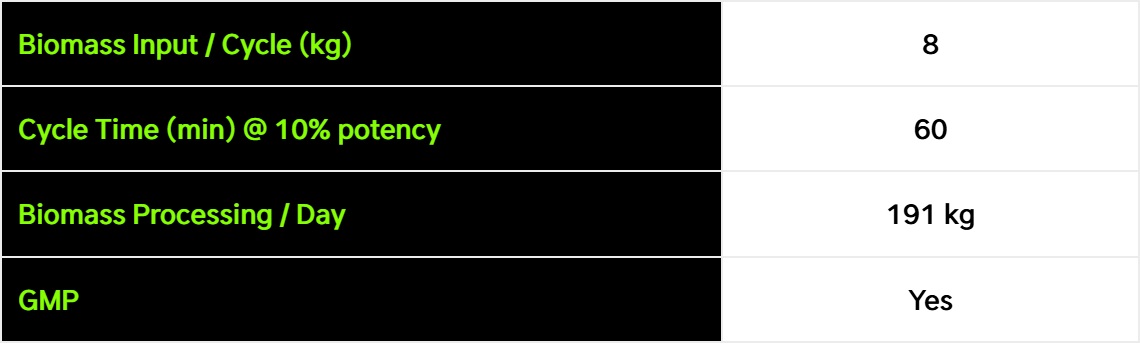 평균 오일 회수 효율은 햄프의 경우 90%+ 마리화나의 경우 95%+ 입니다.
