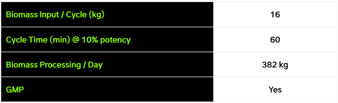| Biomass Processing/Day (up to) | 384-480 kg/846-1058 lbs *Actual Performance Results May Vary |